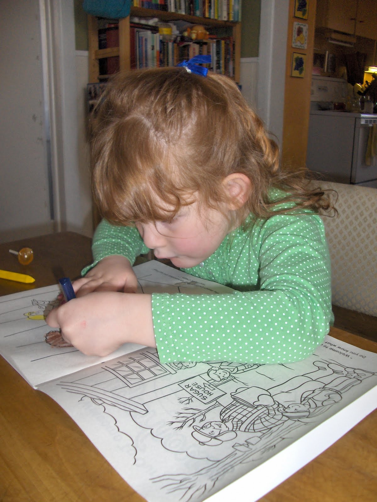 As mentioned in an earlier post, we took a family trip to the Fanshawe sugar bush over March Break, which set Sophie up quite nicely for today's school field trip to a different sugar bush north of London. She was so excited to ride the big yellow school bus with her friends, and I was regretting that I couldn't go with the group as a parent chaperone - watching the bus pull away without me made me a bit sad! She returned home with a critique of the trip (she didn't like the Jaffa sugar bush as much as Fanshawe), a maple sucker, and a new colouring book that tells the story of how maple sap is gathered and turned into maple syrup. Here she is, doing some mapley colouring shortly before her pancake lunch, which was another issue she had with the trip. Apparently she got one very small, very unsatisfying pancake at the end of the tour, so between that and the fact that this sugar bush did not offer a horse-drawn wagon ride she was most unimpressed. Thank goodness mommy has maple syrup in the fridge and can whip up pancakes on a moments notice!